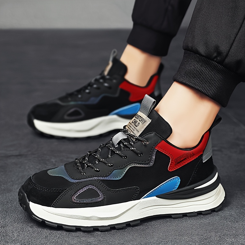 メンズレトロカジュアルスニーカー - ロートップ レースアップPUアッパー&ラバーソール、ブラックに赤/青のアクセント、オールシーズン対応ストリートウェアシューズ